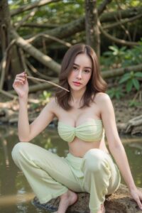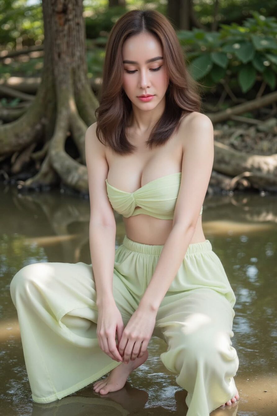 Buk Maya bilang nggak usah nyusul rombongan yang ilang. Besoknya, kita mutusin kemah sendiri, cari spot yang nggak bakal ketemu mereka. Kita nemu tempat kece di tepi jurang, ada goa kecil dan sungai jernih, rimbun, romantis abis. Kita kayak Tarzan sama pasangannya di hutan. Baju kita basah semua, jadi Ariana cuma pake kain dililit di perut buat nutupin “Ms. Veggy”. Aku? Telanjang bulat, baju dijemur di pinggir sungai. Buk Maya dengan outfit minim itu bikin aku horny terus, dia juga kayaknya.